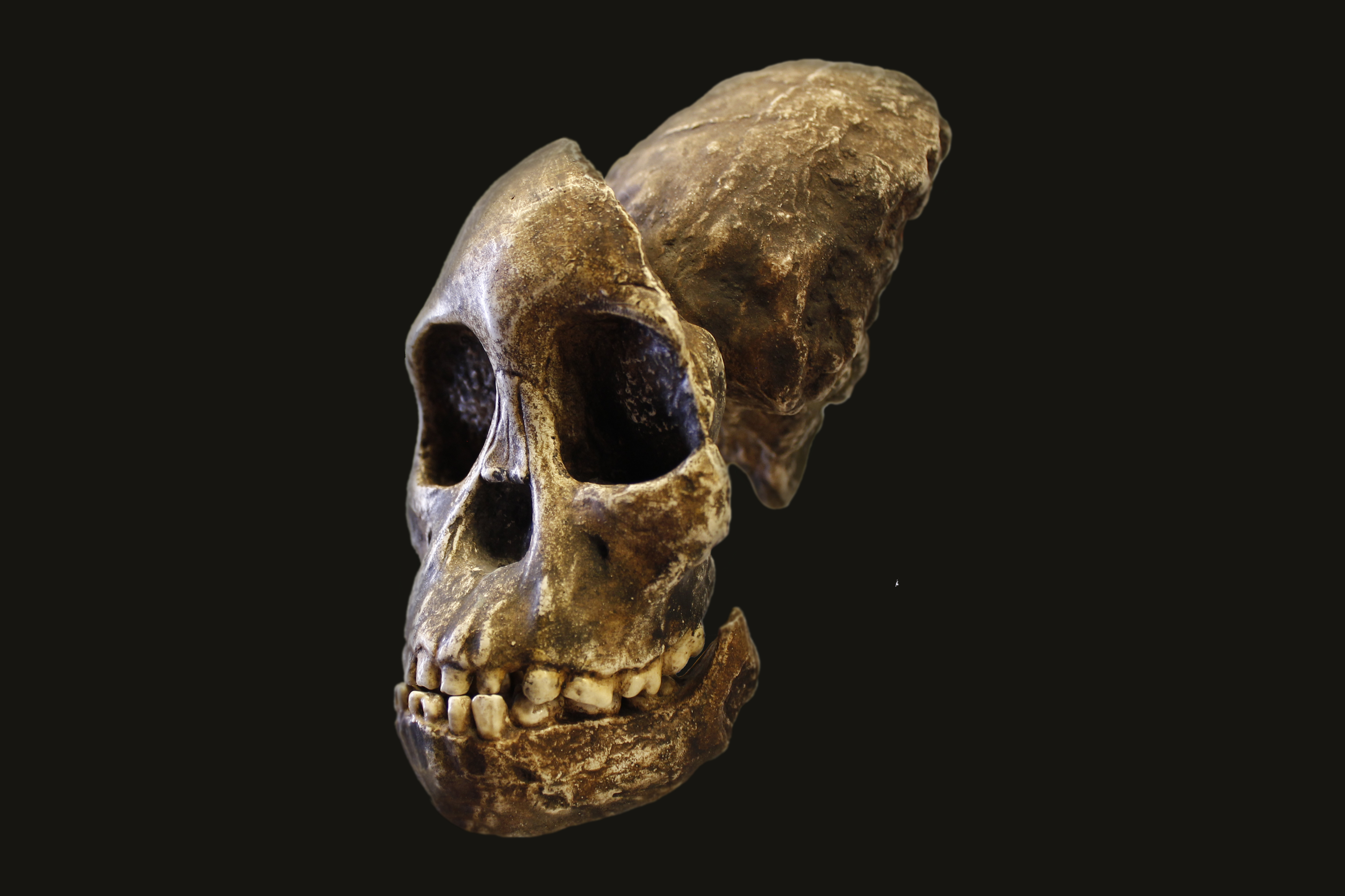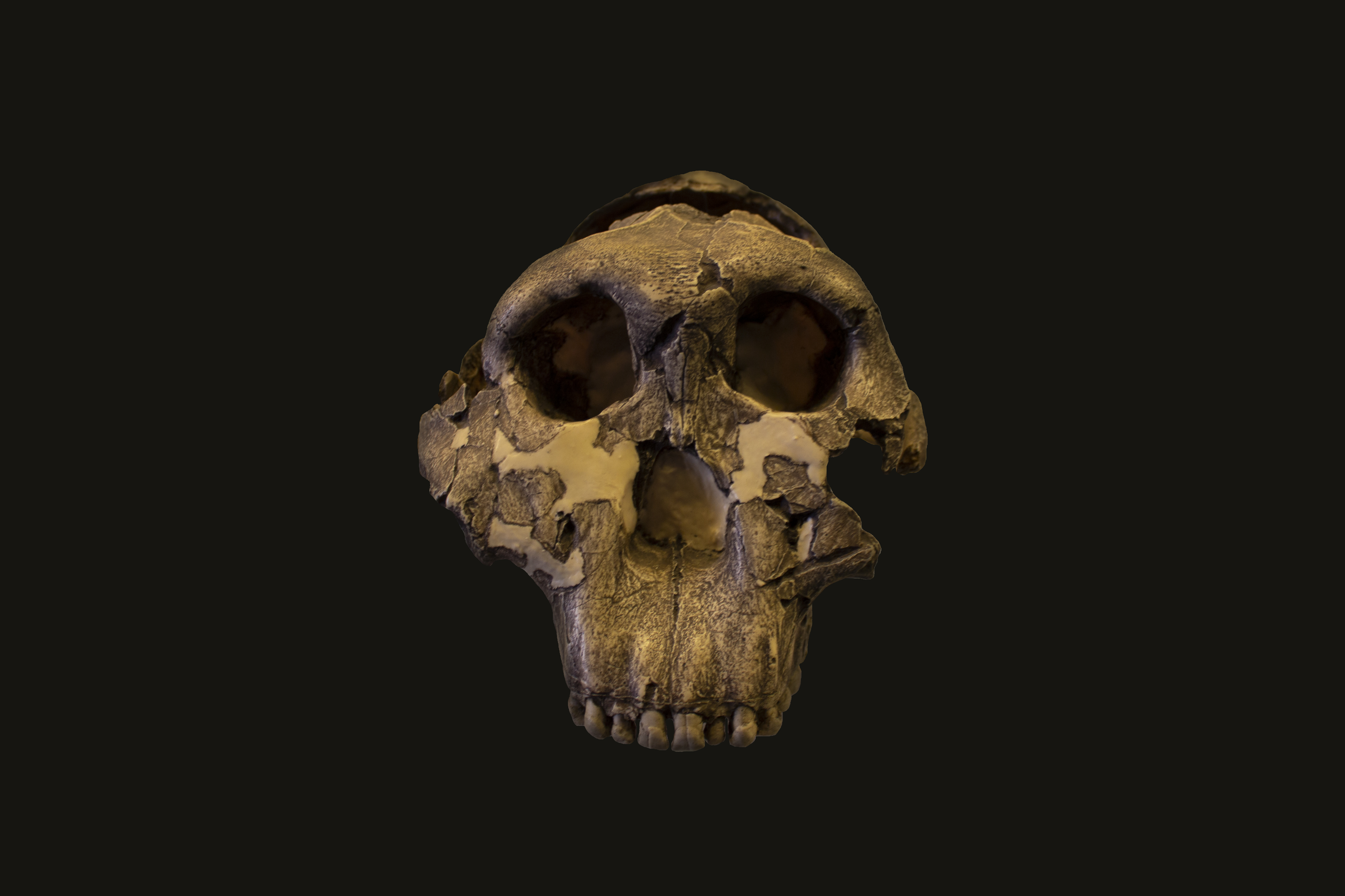 Australopithecus africanusModello di cranio di Australopithecus africanus rinvenuto a Taung nel 1924 all'interno di una cava di calcare, insieme ad una mandibola e ad un calco endocranico naturale. Il ritrovamento venne descritto per la prima volta da Raymond Dart, il quale ritenendolo attribuibile ad un ominino antico, creò per identificarlo il genere Australopithecus (scimmia dell'Africa meridionale), a cui aggiunse successivamente il nome specifico di africanus. I reperti erano riferibili ad un giovane individuo dell'età di circa tre-sei anni con cervello ancora molto piccolo (405 cm³) e caratteristiche anatomiche evolute: dentatura dall'aspetto umano, con canini ridotti, e cranio caratterizzato alla base da foro occipitale in posizione avanzata, indice di un adattamento al bipedismo. L'età del reperto è stimata essere intorno a 1,2 milioni di anni. |